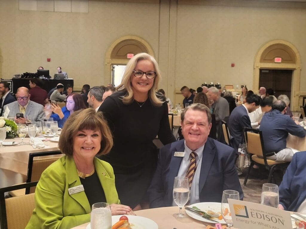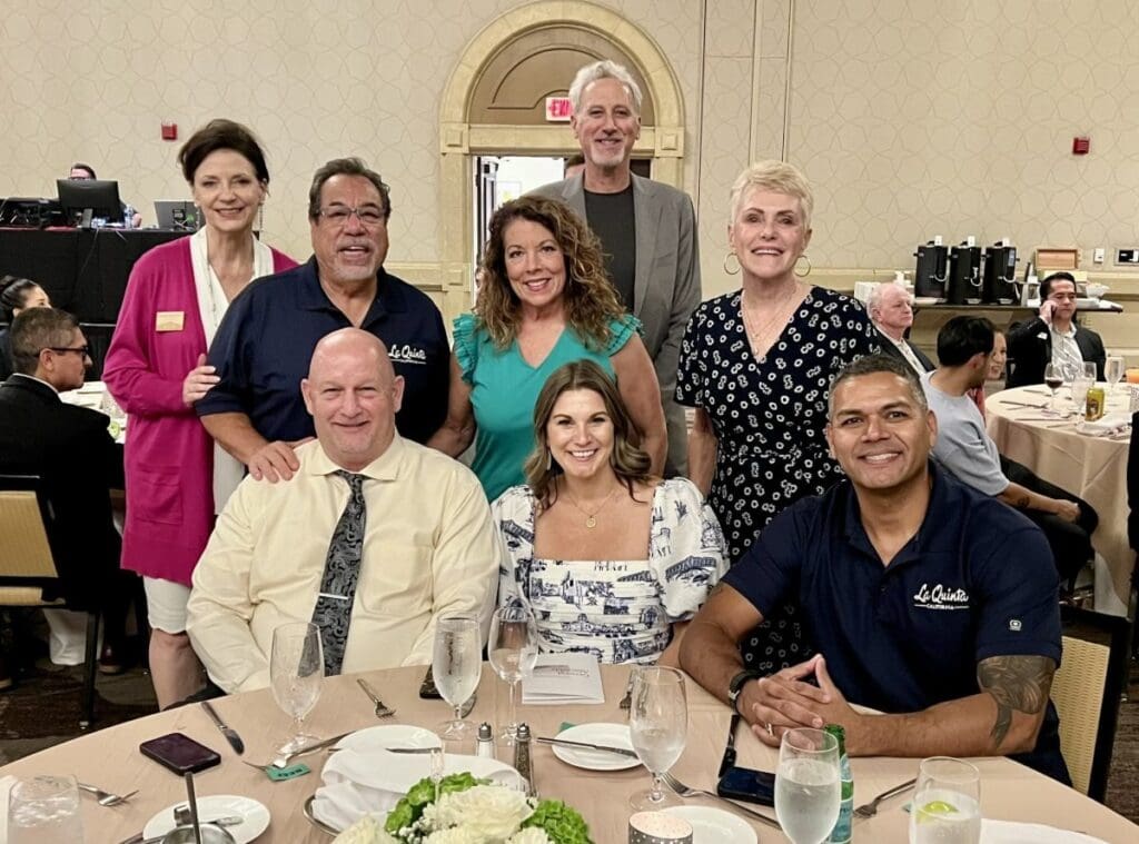 Smiling group at a banquet table.