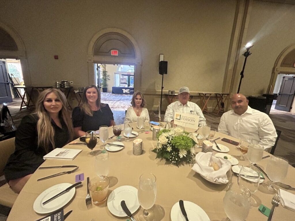 Five people at a banquet table